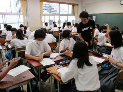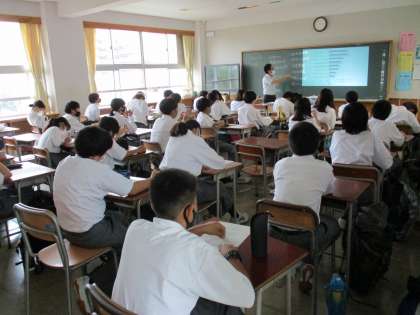 進路学習として「ひとはなぜ働くのか」について班で話し合ったり説明を受けたりと楽しそうに学んでいました。