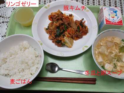 今日の給食 公開日 2021/07/09 更新日 2021/07/09 学校日記 人気の豚キムチです。暑い時でも食欲が上がります。麦ごはん、冬瓜と卵のスープにデザートとして🍏リンゴゼリーがつきます。 昨日のたこ飯のタコについての解説が各学年の廊下に貼ってあります。 いいね(0)