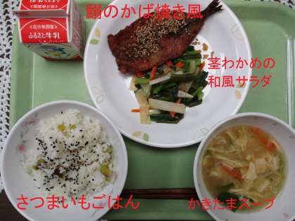 今日の給食は 公開日 2021/09/17 更新日 2021/09/17 学校日記 今日の主菜のさつまいもごはんは、さつま芋の甘みと黒ゴマの風味が美味しさを引き立てます。それに鰯のかば焼き風、茎わかめの和風サラダゆず風味、かきたまスープの献立です。 いいね(0)