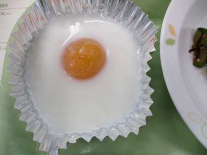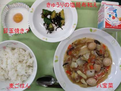 麦ごはんに八宝菜、きゅうりの塩昆布和えに目玉焼き?です。見れば見るほど目玉焼きに見えます。実は、杏子とミルクゼリーのデザートです。