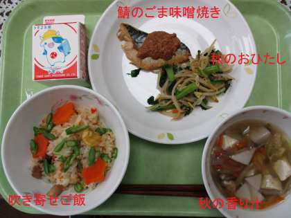 今日の給食は 公開日 2021/10/05 更新日 2021/10/05 学校日記 吹き寄せご飯、秋の香り汁、鯖のごま味噌焼き、秋のおひたし、みかんと秋色満載です。炊き寄せご飯の彩は鮮やかです。 いいね(0)