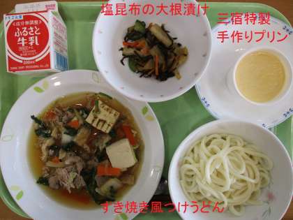 今日の給食は 公開日 2021/10/06 更新日 2021/10/06 学校日記 すき焼き風つけうどんに塩昆布の大根漬け、三宿特製手作りプリンです。プリンのレシピが事務室前に置いてあります。 いいね(0)
