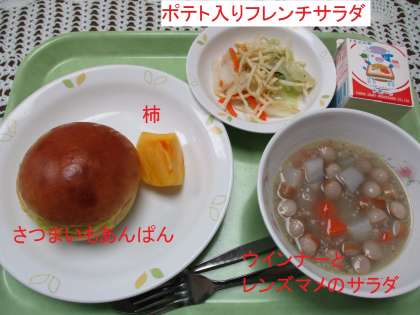今日の給食は 公開日 2021/10/19 更新日 2021/10/19 学校日記 さつまいもアンパン、ウインナーとレンズマメのスープ、ポテト入りフレンチサラダ、デザートに柿が付きます。さつま芋に柿、まさに秋の味覚です。 いいね(0)
