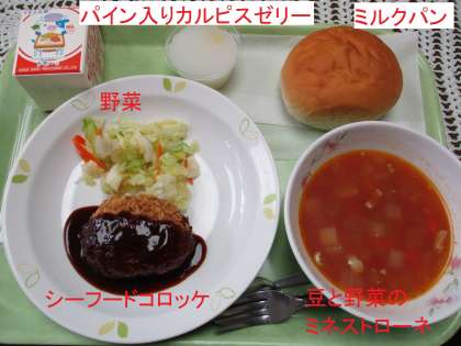 今日の給食は 公開日 2021/11/01 更新日 2021/11/01 学校日記 11月最初のメニューは、ミルクパン、シーフードコロッケと野菜、豆と野菜のミネストローネ、デザートにパインカルピスゼリーが付きます。シーフードコロッケはミルクパンにはさんで食べます。 いいね(0)