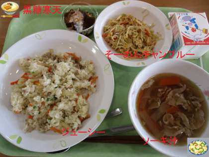 郷土料理給食+図書室とのコラボ給食 公開日 2021/11/04 更新日 2021/11/04 学校日記 今回は沖縄県です。ジューシー(沖縄風炊き込みご飯)に、ソーキ汁、そうめんチャンプルー、デザートに宮古島の黒糖寒天です。今回の黒糖は宮古島の多良間村のものです。沖縄料理楽しみに“いただきます。” いいね(0)