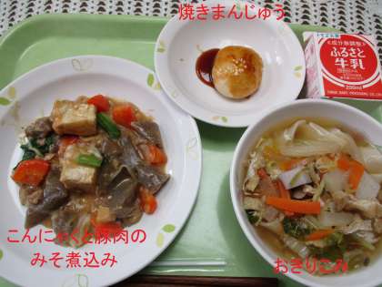 今回は群馬県の郷土料理です。おきりこみと、こんにゃくと豚肉の味噌煮込み、群馬県のおやつの定番焼きまんじゅうです。久しぶりの給食楽しみです。