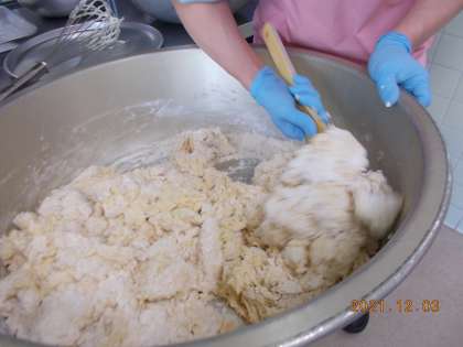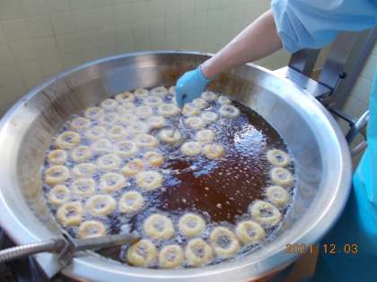 生地をこねて、油であげています、中央の穴がつぶれないように
