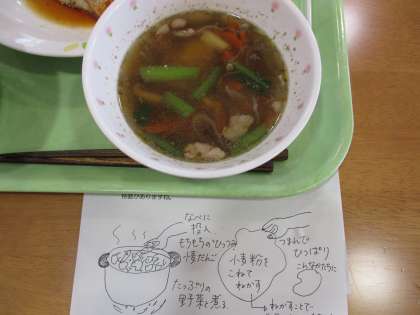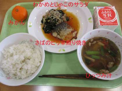 きょうの給食 公開日 2021/12/07 更新日 2021/12/07 学校日記 岩手県の郷土料理給食です。麦ごはんにさばのピリ辛照り焼き、ひっつみ汁、わかめとじゃこの和風サラダ、デザートにみかんです。このひっつみ汁は小麦粉をこねたものをつまんで小さきちぎることからそう呼ばれるようになったそうです。 いいね(0)