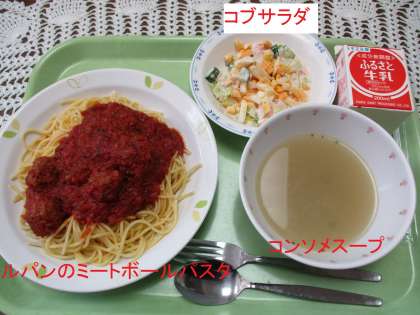 きょうの給食 公開日 2021/12/10 更新日 2021/12/10 学校日記 ルパンのミートボールパスタにコブサラダ、コンソメスープです。映画「カリオストロの城」で出てくるスパゲティです。フォークに巻き付けて取り合いになるシーンが有名です。おかわりは取り合いせずに! いいね(0)