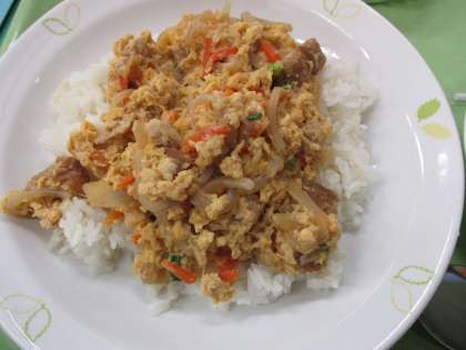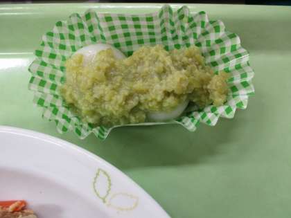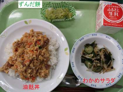 宮城県の郷土料理、油麩(仙台麩)丼です。卵でとじたどんぶりです。それにわかめサラダ、これも有名な枝豆を使った緑色のきれいなずんだ餅がつきます。