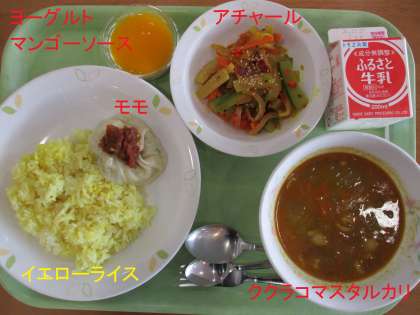 きょうの給食 公開日 2021/12/16 更新日 2021/12/16 学校日記 世界の料理から、今回はネパール料理です。ククラコマスタルカリにイエローライス、アチャールとモモです。デザートにヨーグルトマンゴーソースがつきます。(チキンカレーに、ネパールの漬物、ネパール餃子です) いいね(0)