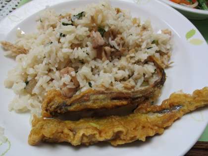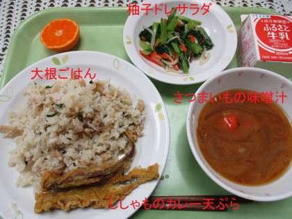 世田谷育ち野菜を使った給食、大根ごはん、ししゃものカレー天ぷら、柚子ドレサラダにさつまいのもみそ汁、みかんがデザートで付きます。