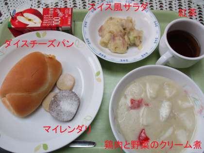 きょうの給食 公開日 2021/12/23 更新日 2021/12/23 学校日記 2学期最後の給食は、世界の料理からスイス料理です。ダイスチーズパン、鶏肉と野菜のクリーム煮、スイス風ポテトサラダ、マイレンダリ(クッキー)と紅茶とジュースです。スイスではクリスマスシーズンにクッキーを焼くそうです。 いいね(0)