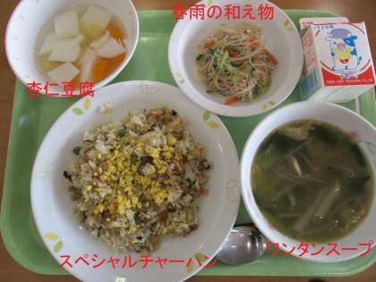 きょうの給食 公開日 2022/01/18 更新日 2022/01/18 学校日記 スペシャルチャーハン、春雨の和え物にワンタンスープ、デザートに杏仁豆腐です。チャーハンは炒めることができないのでスープで炊くなど栄養士さん給食さんのおいしさアップの努力が詰まっています。 いいね(0)