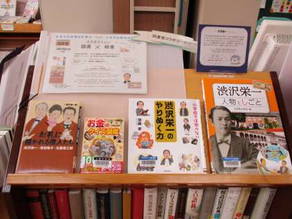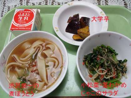 渋沢栄一の煮ぼうとう、大学いも、小松菜・茎わかめ・じゃこのサラダです。図書室にもコーナーができていますのであしを運んでください。