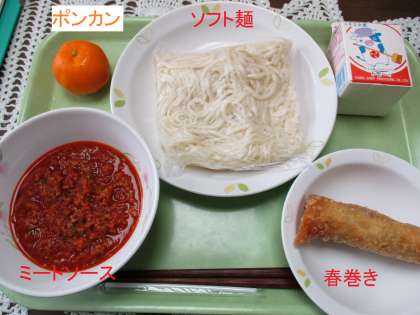 ソフト麵のミートソース、春巻きにみかん(ポンカン)です。ソフト麺は1960年代にパンのみだった給食の主食を増やすために開発されたものです。今は商品・設備開発が進み姿をみることがなくなりました。