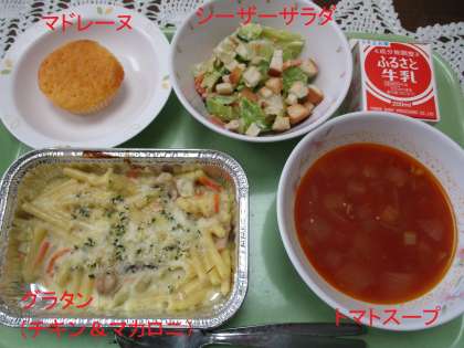 きょうの給食 公開日 2022/02/02 更新日 2022/02/02 学校日記 3年生が家庭科の授業で栄養士さんのアドバイスを受けながら献立を立てました。今日はその第1弾3年D組「ちょうちょちょっと取って頂戴」班の考えたメニューです。グラタン(チキン&マカロニ)、シーザーサラダ、トマトスープ、デザートにマドレーヌです。 いいね(0)