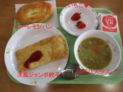 きょうの給食 公開日 2022/02/04 更新日 2022/02/04 学校日記 今回は3年A組派闘班の考えた献立、ハニーレモンパン、洋風ジャンボ餃子、ABCパスタスープ、デザートにいちごです。 いいね(0)