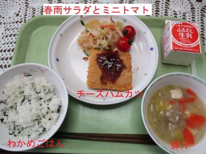 きょうの給食 公開日 2022/02/07 更新日 2022/02/07 学校日記 今日は3年A組ゆずコショウサラダ班と3年D組おいしい給食班の考えたわかめごはん、チーズハムカツ、豚汁に春雨サラダとミニトマトです。 いいね(0)