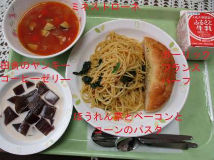 きょうの給食 公開日 2022/02/08 更新日 2022/02/08 学校日記 ほうれん草とベーコンとコーンのパスタ、ミネストローネ、ガーリックフランス(ハーフ)です。今回は3年C組 はにわ男女班の田舎のヤンキーコーヒーゼリーがデザートにつきます。 いいね(0)