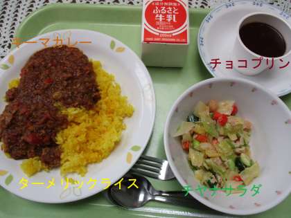 きょうの料理 公開日 2022/02/14 更新日 2022/02/14 学校日記 ターメリックライスにキーマカレー、チャナサラダにお楽しみデザートです。ひき肉(細かい肉=キーマというそうです)を使ったカレーです。デザートは初登場のチョコレートのプリンです。 いいね(0)