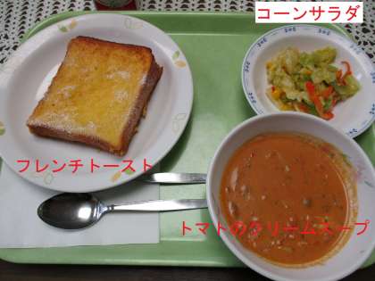 フレンチトーストにトマトのクリームスープ、コーンサラダです。フレンチトーストは人気のパン料理のひとつです。