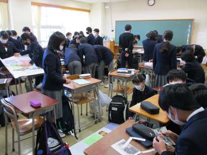調べたものを各班模造紙にまとめています。今日の完成にむけて絶賛作成中です。
