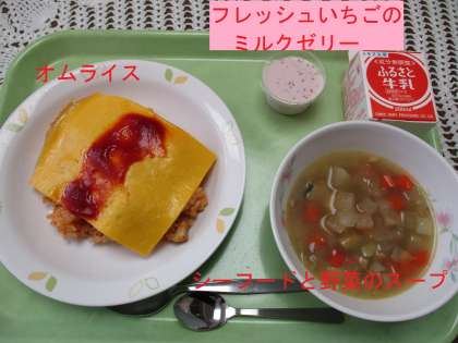 きょうの給食 公開日 2022/02/21 更新日 2022/02/21 学校日記 オムライスにシーフードと野菜のスープ、デザートにいちごミルクゼリーです。洋食の代表料理のひとつオムライスです。ケチャップソースにもひと手間かけおいしさアップです。 いいね(0)