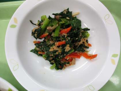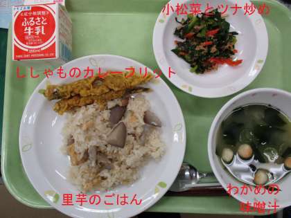 里芋ごはんにししゃものカレーフリット、小松菜とツナ炒め、わかめの味噌汁です。小松菜に含まれるビタミンAは免疫力を高めてくれて、炒めたことで油が吸収よくしてくれます。