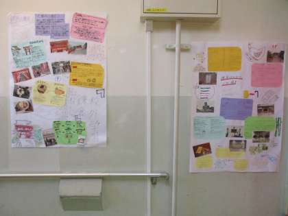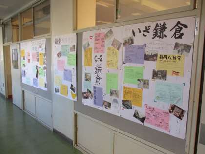 2年生が作成した校外学習の班ポスターが廊下に展示されています。彩がよく目を引きます。