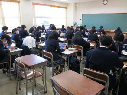1年生は、映像で1年間を振り返っていました。2年生は、タブレットや冊子資料を活用し上級学校について調べていました。3年生は合唱練習に力が入ります。明日は卒業式予行です。