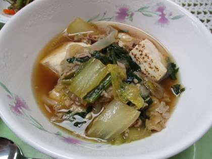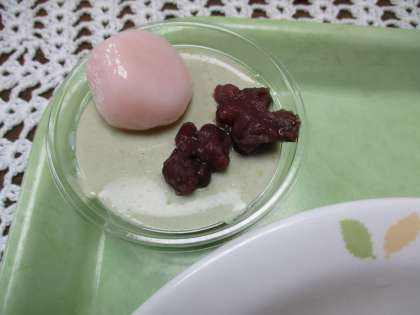 すき焼きうどんに茎わかめとごまのサラダ、抹茶ミルクゼリー 白玉入りです。すき焼きは日本独特の鍋料理です。