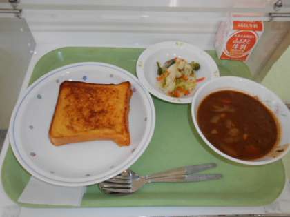 フレンチトースト 牛乳 ビーンズシチュー 春キャベツのサラダ