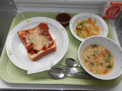 ピザトースト 牛乳 トウモロコシとたまごのスープ ハニーサラダ