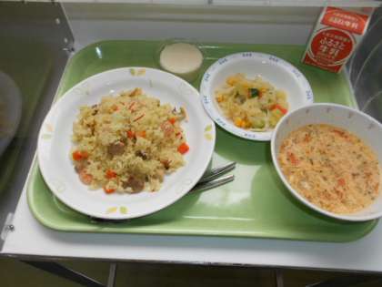 パエリア 牛乳 ポテト入りフレンチサラダ 卵スープ ヨーグルトゼリー