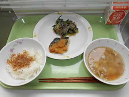 ごはん ふりかけ 牛乳 鯖塩焼きおろし醤油 春雨とひじきのサラダ 豚汁
