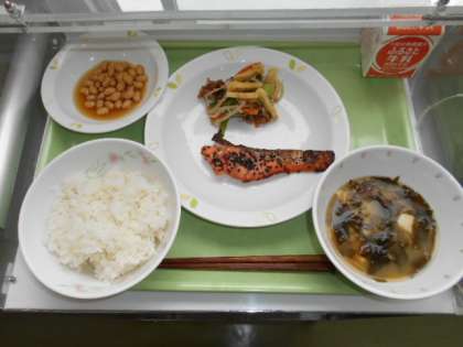麦ごはん 牛乳 鮭の南部焼き カリカリ油揚げと野菜のひたし