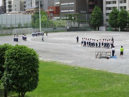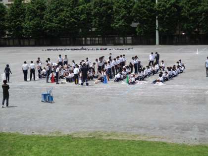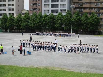 3年生は学年練習です。少ない練習時間を有効に使います。はじめて学年種目ムカデ競争をおこないました。