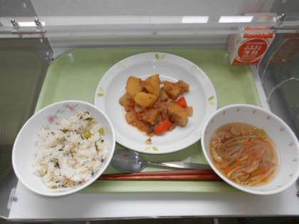 青菜とじゃこのごはん 牛乳 新じゃが芋のそぼろ煮