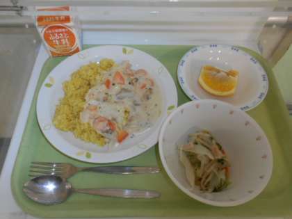 ドリア 牛乳 ベーコンと水菜のサラダ くだもの