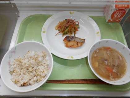 豆ごはん 牛乳 魚の照り焼き かみかみサラダ 豚汁