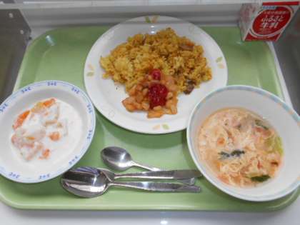 カレーピラフ 牛乳 大豆とコーンのフリッター 卵スープ