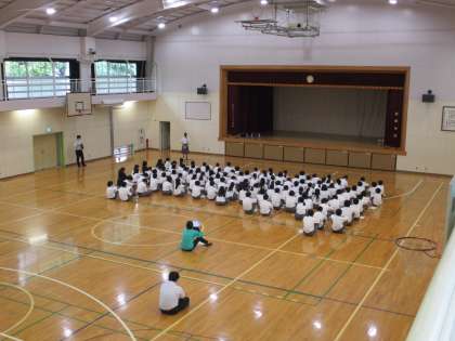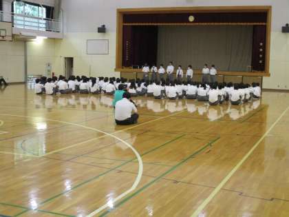 体育館で移動教室に向けて実行委員紹介、実行委員長の言葉がありました。これから本格的に準備が始まります。