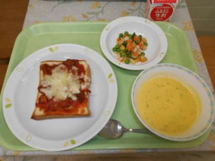 ピザトースト 牛乳 キャロットポタージュ ビーンズサラダ