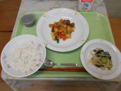 麦ごはん 牛乳 かつおの揚げ煮 青菜とわかめのかんきつじょうゆ