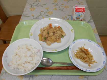 麦ごはん 牛乳 ジャガイモのそぼろ煮 もやしのカレーじょうゆかけ