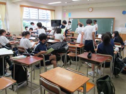 2年生は期末考査のまとめが返却され併せて1学期の反省を行っていました。3年生は修学旅行に向けて事前学習のテーマきめを行っていました。