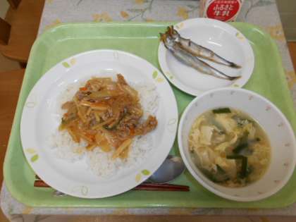 スタミナ丼 牛乳 焼きししゃも にらたまスープ