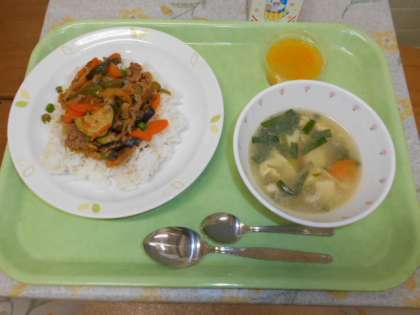 夏野菜のキムチ丼 牛乳 ザーサイスープ みかんゼリー