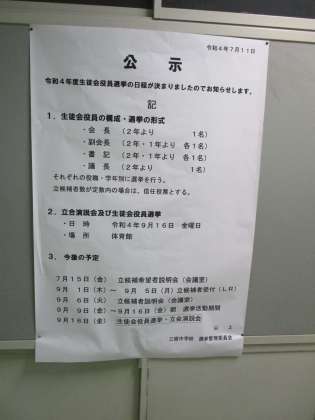 選挙管理委員会より委員長からの報告があり、告示がされました。立候補を受け選挙活動に入ります。